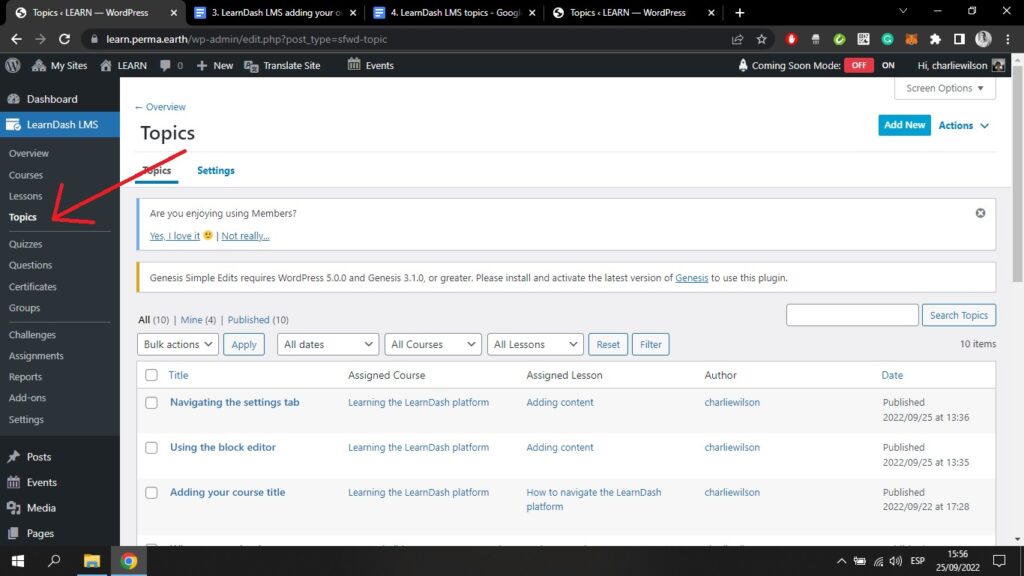 Wenn Sie sich in das Backend von WordPress einloggen, können Sie in den Bereich Themen in der Registerkarte LMS LearnDash Plugin auf der linken Seite Ihres Bildschirms;