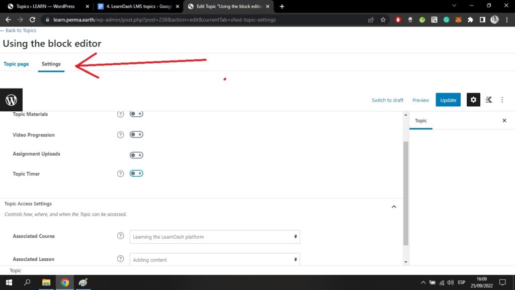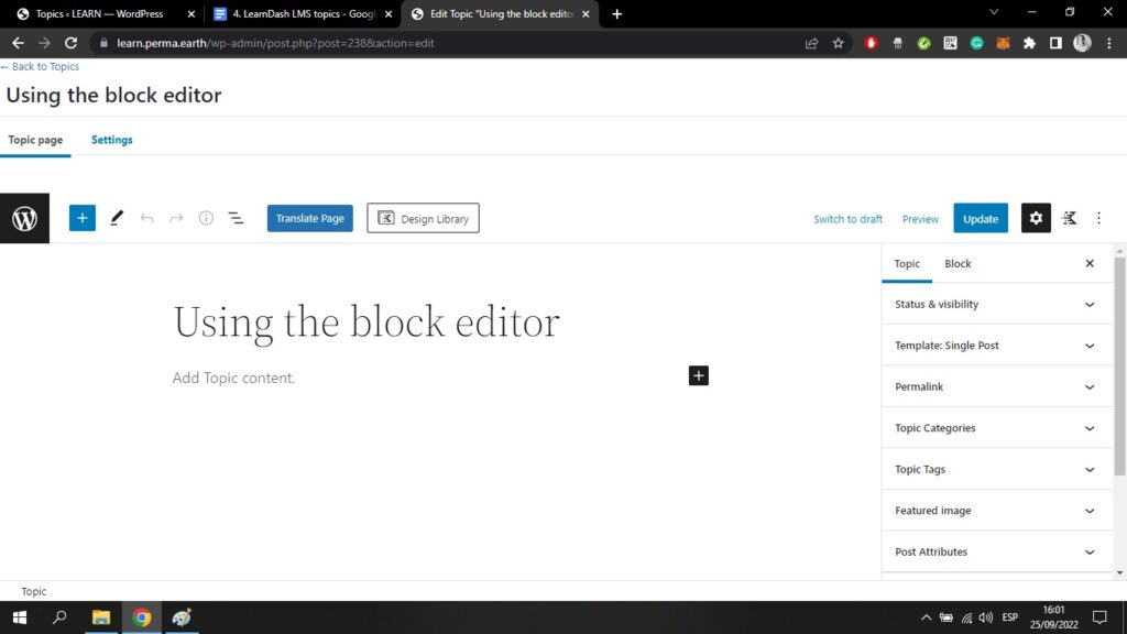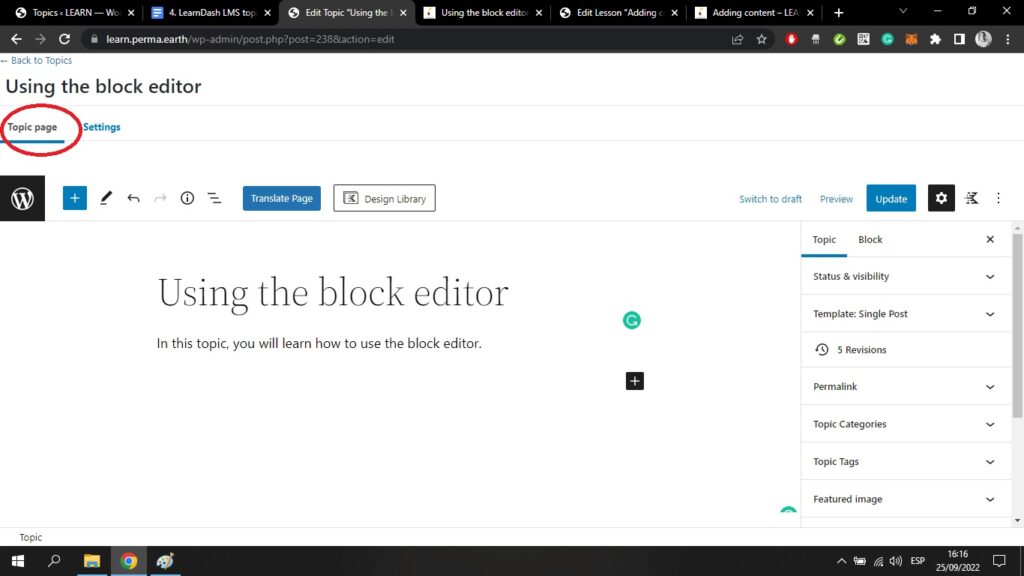 Sie können den Titel des Themas sehen, der in diesem Fall "Verwendung des Blockeditors" lautet. Hier stehen Ihnen alle Funktionen zur Verfügung, die Sie auch in der Seite der Lektion.