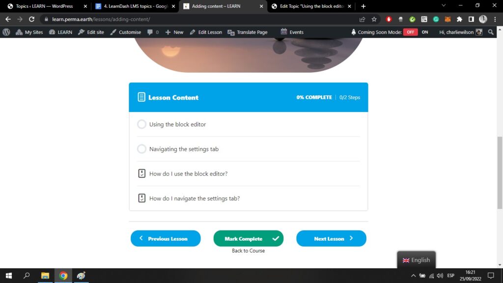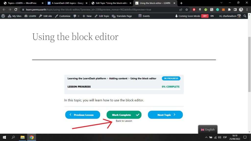 Wenn Sie auf "Zurück zur Lektion" klicken (siehe Pfeil oben), können Sie zurück zu Ihrer Lektionsseite im Frontend navigieren.