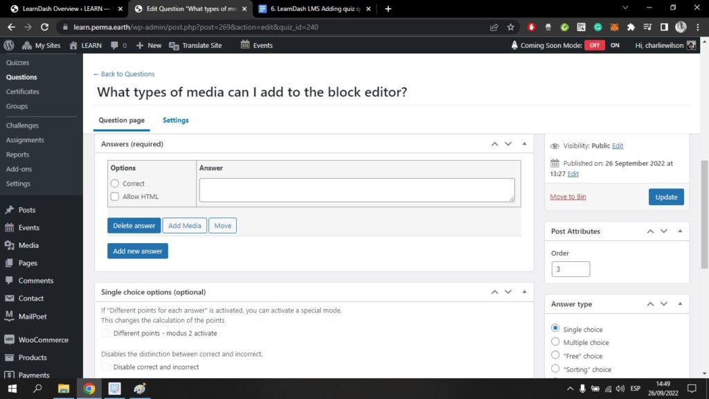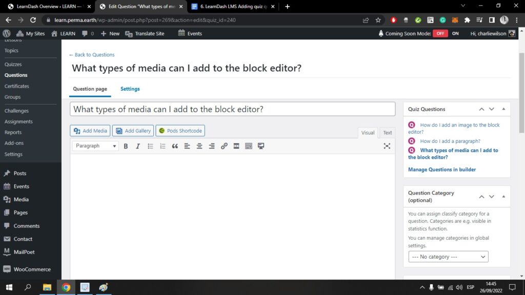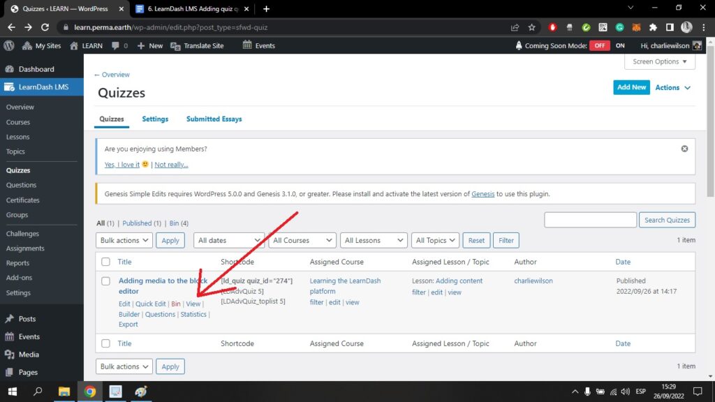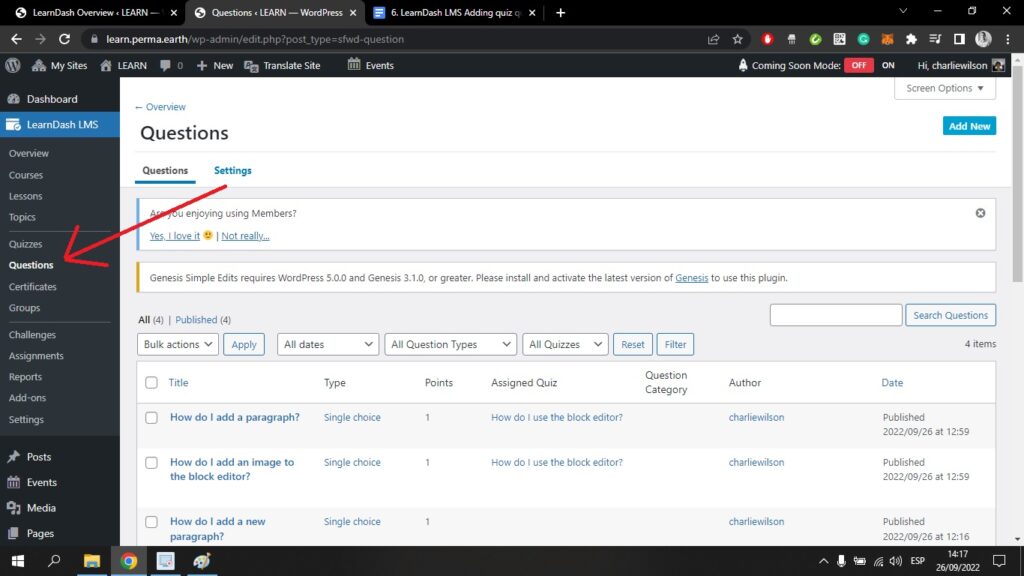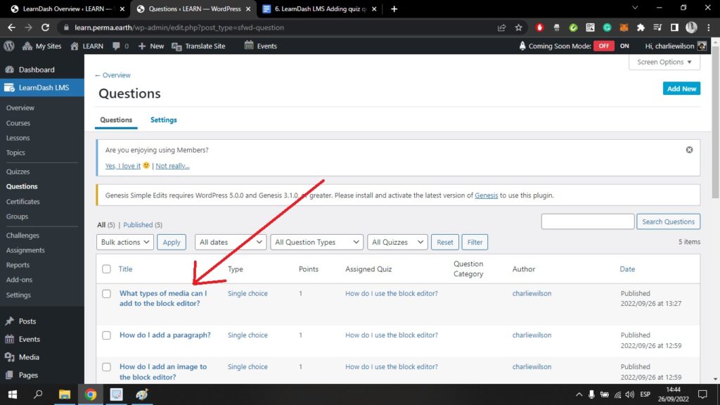 Ich komme zurück zum Fragen Ich werde auf eine der Fragen klicken, die ich zuvor erstellt habe, indem ich das Quiz Erbauer;