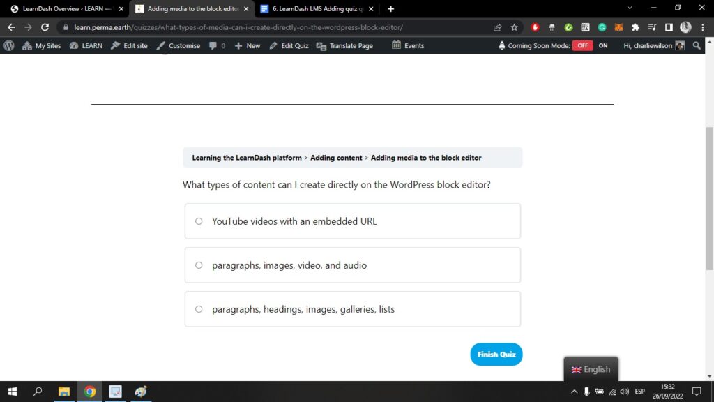 Wenn Sie sehen möchten, wie Ihr Quiz auf dem Frontend aussehen wird, können Sie zurück zum Quizze auf der linken Seite;