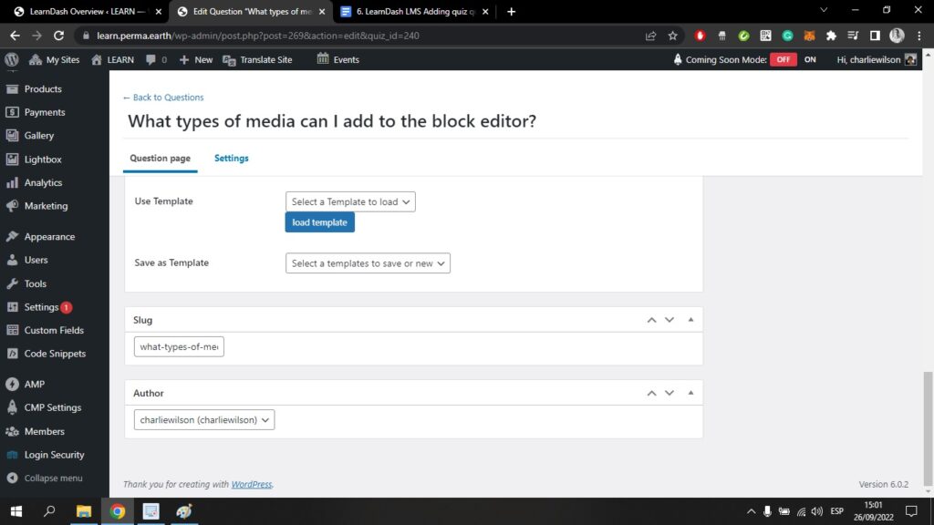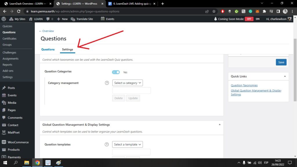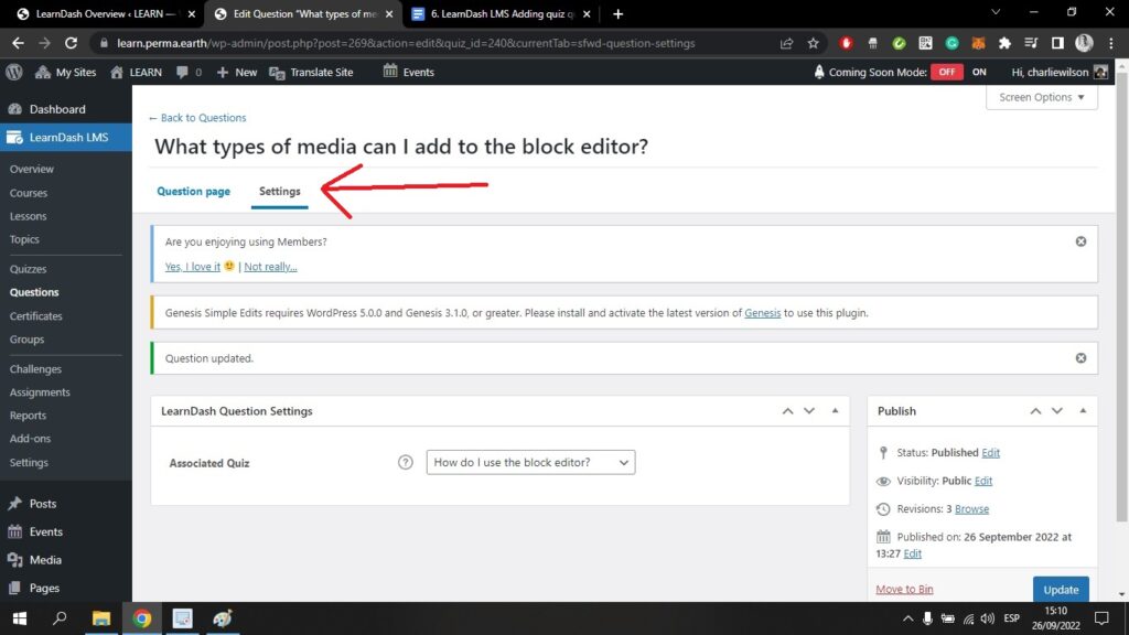 Wenn Sie auf die Schaltfläche Einstellungen oben auf der Seite können Sie einfach auswählen, mit welchem Quiz diese Frage verbunden ist;