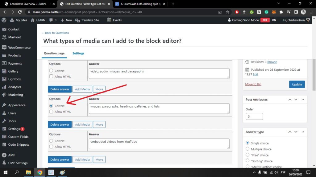Wenn ich auf der Seite weiter nach unten scrolle, kann ich auswählen, wie viele Punkte ich dieser Quizfrage zuweisen möchte. Ich kann auch ein besonderes Bild hinzufügen.
