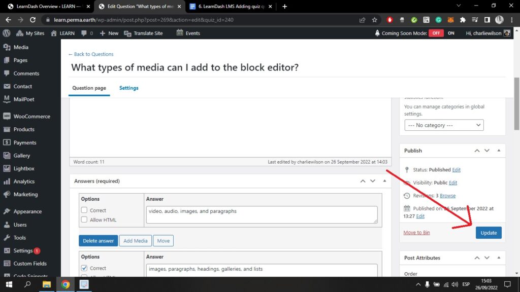 Wenn Sie die Einrichtung Ihrer Fragenseite abgeschlossen haben, denken Sie daran, auf die blaue Update Taste;