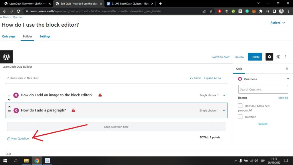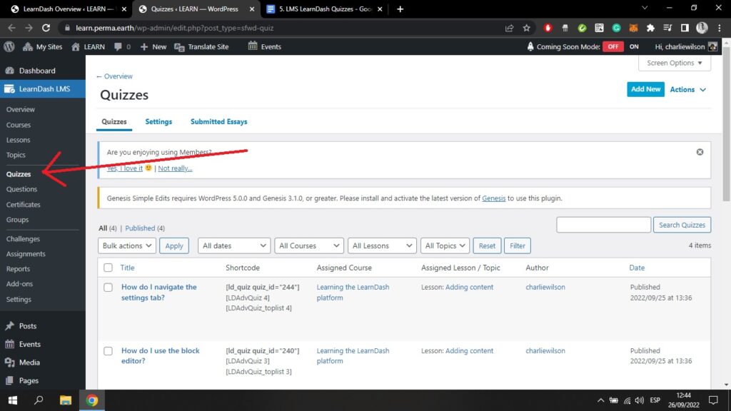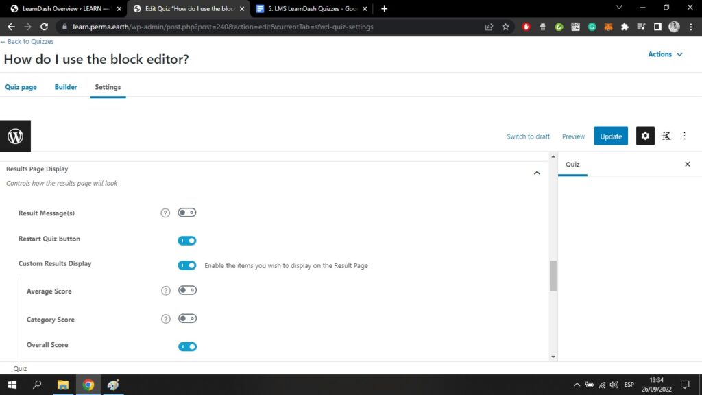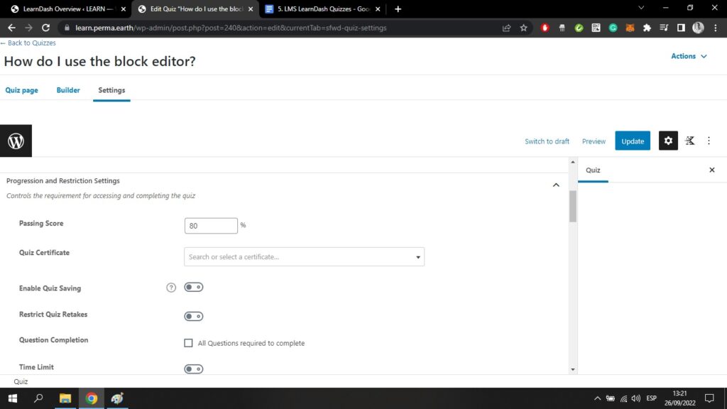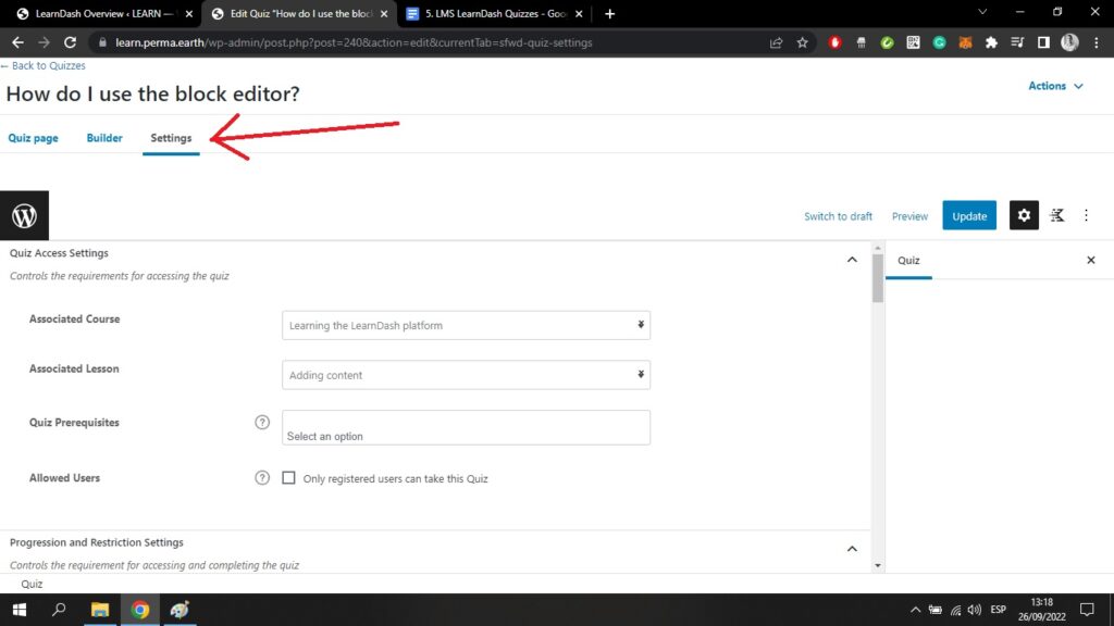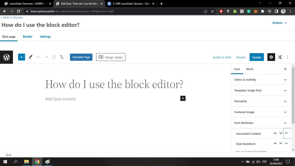 Wenn Sie zurückgehen zum Quizze oben links auf Ihrem Bildschirm und klicken Sie auf ein Quiz, das Sie bereits mit dem Kurs-Builder erstellt haben, gelangen Sie in den WordPress-Block-Editor;
