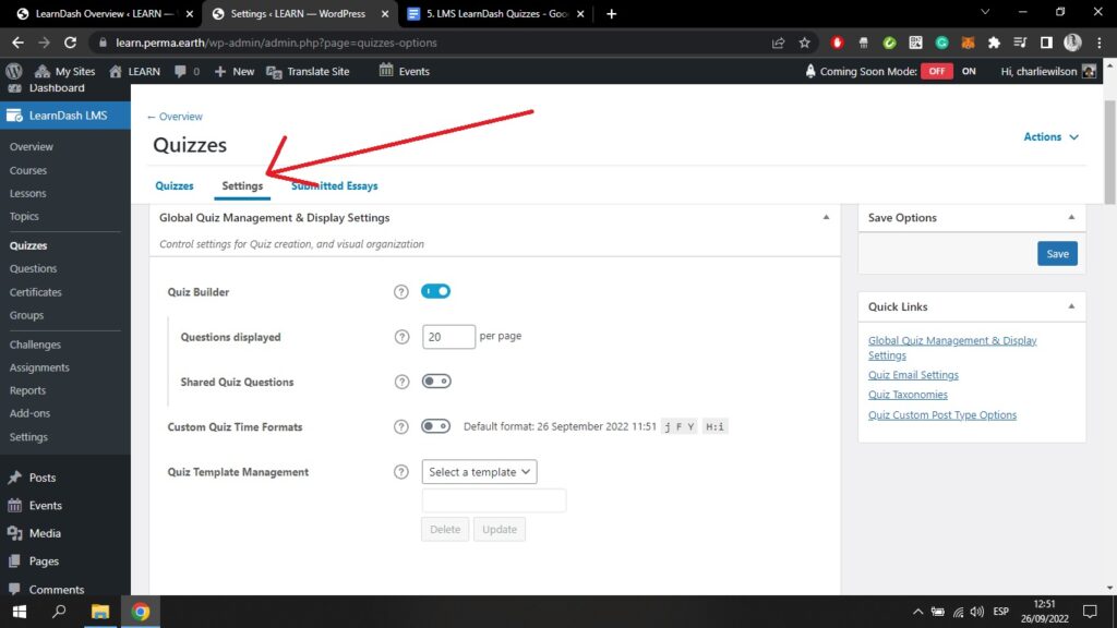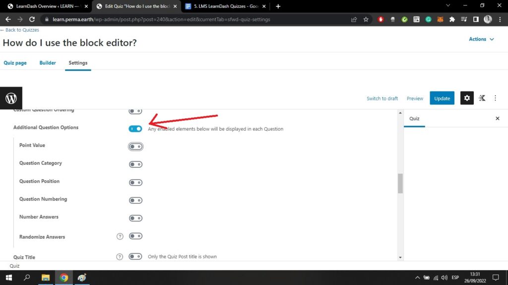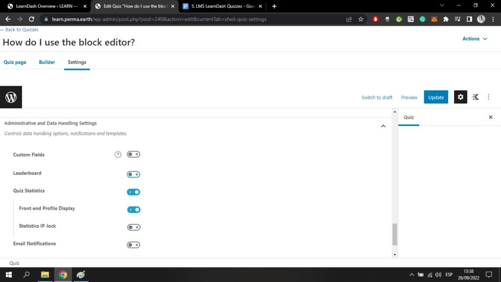 Werfen wir einen Blick auf das Quiz Einstellungen tab;
