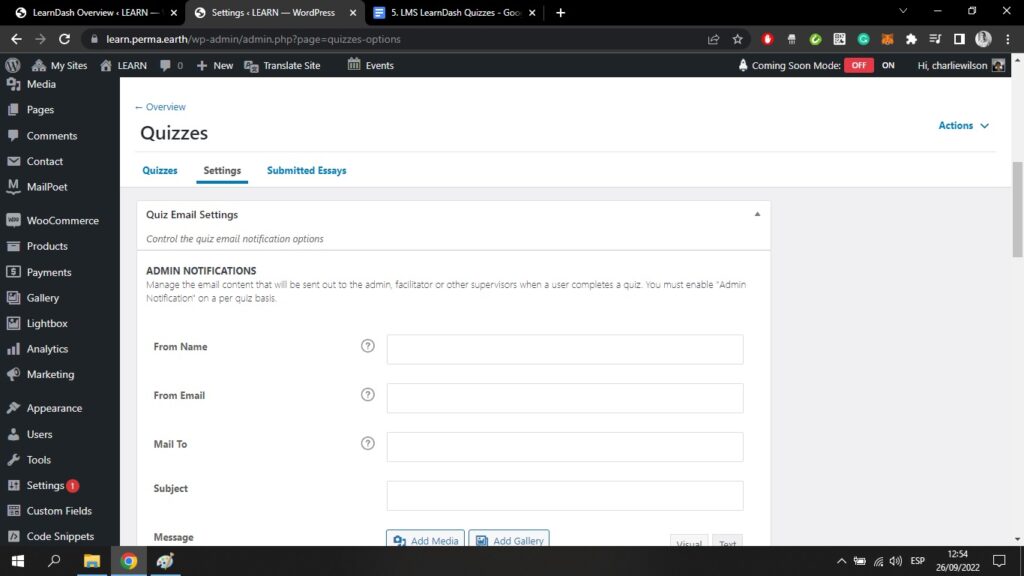 Hier können Sie die Benachrichtigungen einstellen, die sowohl der Administrator als auch die Benutzer erhalten, wenn ein Benutzer ein Quiz abgeschlossen hat.