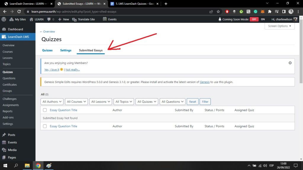 Am oberen Rand des Bildschirms befindet sich eine Registerkarte mit der Bezeichnung Eingereichte Aufsätze. Wenn Ihr Quiz die Abgabe eines Aufsatzes erfordert, wird dieser auf dieser Seite angezeigt und kann von Ihnen überprüft werden;